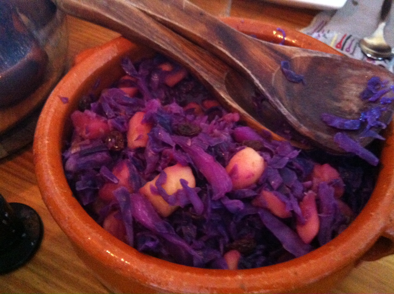 Así que corté la lombarda en juliana y con solo un dedo de agua la puse a hervir bien tapada, con el objetivo que se hiciera con el vapor a fuego medio. Tras 15 minutos de cocción, la aparté y le añadí las pasas para que se hincharan en el escaso líquido que aún quedaba en el caldero y lo aparté del fuego. Más tarde, justo antes de empezar a comer, salteamos la manzana cortada en daditos en aceite aromatizado con dos ajos y la lombarda.